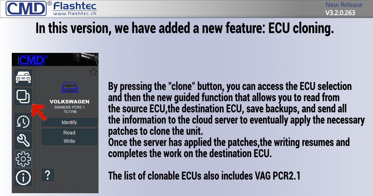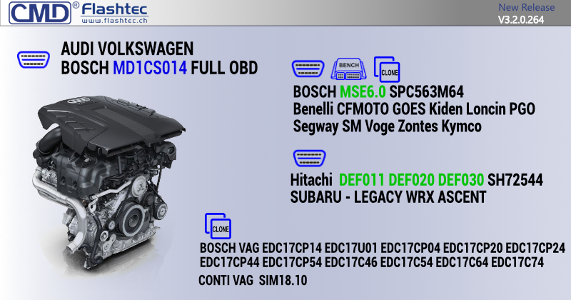 These new OBD protocols allow you to manage the map and firmware areas of Bosch MD1CP006,MD1CP062,MG1CS060,MG1CS055 and MG1CS040 ECUs. The solution operates directly through the diagnostic port.